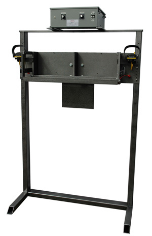 The heat sealers and trim sealers are constructed of welded steel tubing and are designed for heavy duty use; to join thick materials or make extra long seals. The horizontal movement of the sealing jaws allows them to overhang the work area. The sealing jaw assembly is mounted on a floor standing frame and can be located at different distances from the floor to accommodate different bag heights. The bag is moved under the sealing jaws by hand or conveyor. Standing at the machine, the operator pulls the open end of the bag between the sealing jaws, then strikes a foot switch or hits two palm buttons to close the jaws, starting the sealing cycle. After the jaws have closed, the operator is free to perform other useful tasks.